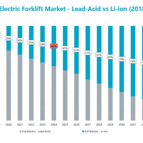 According to Interact Analysis, Li-ion forklifts are raising and projects penetration rates will soar from approximately 32% in 2024 to over 70% by 2034 within the full-electric sector (which includes Li-ion and Lead-Acid models)
